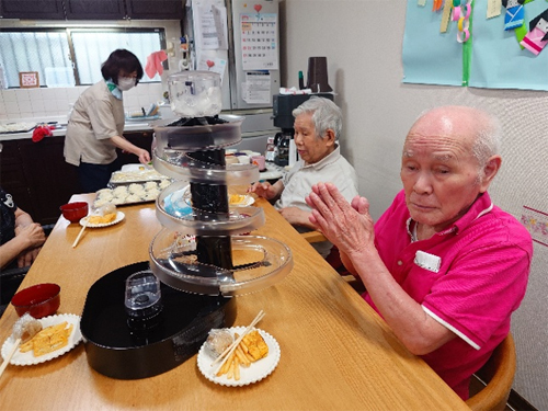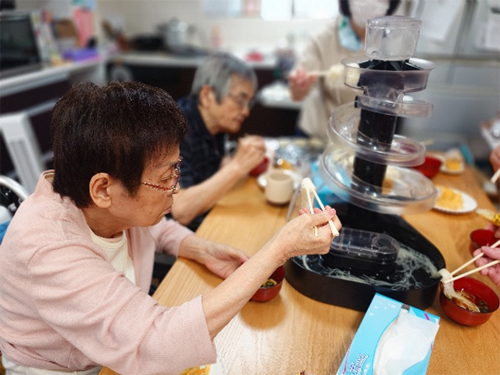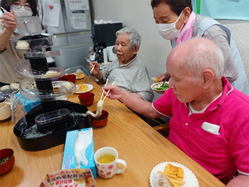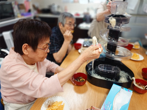 ループになった流しそうめん器から流れてくるそうめんは涼しげで、暑さを忘れるおいしさでした。