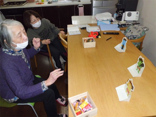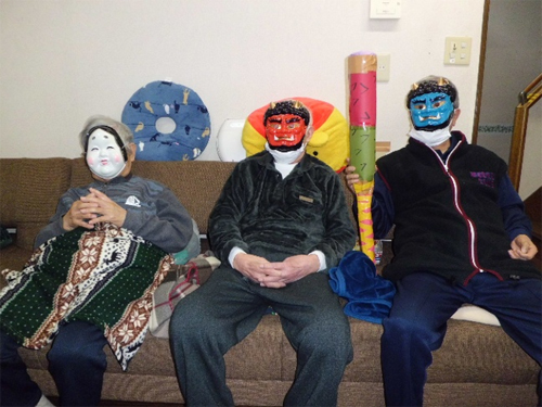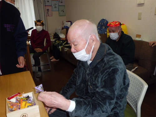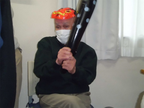 鬼のお面と金棒を持って記念撮影したら、甘納豆の小袋を豆に見立てて鬼のオブジェめがけて投げ、押し倒すゲームで盛り上がりました。